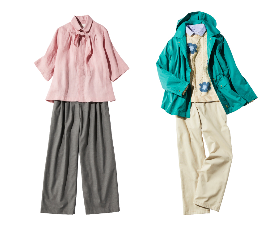 鮮やかなグリーンのブルゾンに大きめの花柄ニットで、春らしさ満開。「マックレガー」らしい洗練された上品さが漂うスタイルで、大人のカジュアルを。