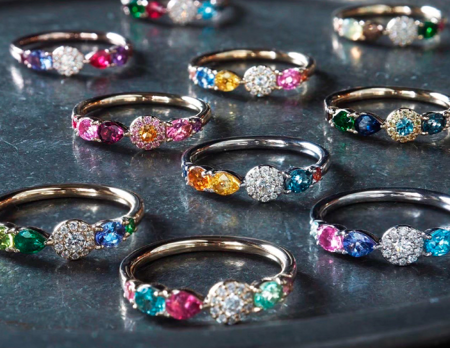 異なるカットの石を一本のリングに調和させた左右非対称のデザインは、自然の揺らぎを表現。様ざまに色づくカラフルな輝きは、一本でも重ねても楽しめます。