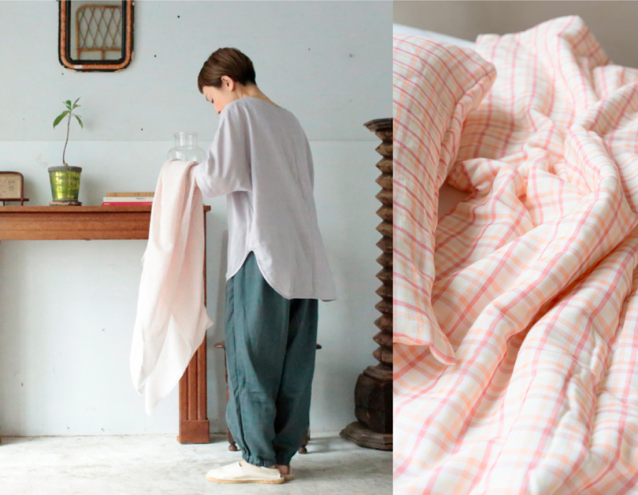 極細繊維の布状の綿を、ガーゼで挟んだ薄綿布団。春に一枚で気持ちいい、やわらかな仕上がりに。おうちで洗えて乾きが早いのもうれしい。