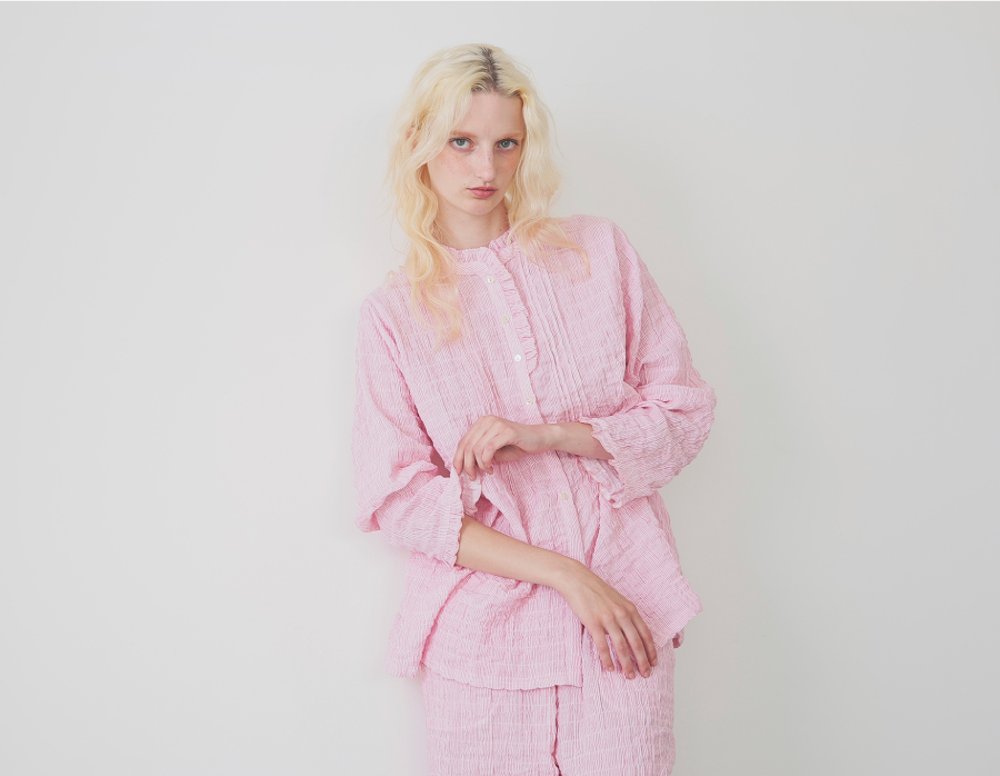 自然なシワと凹凸感のあるシャーリング加工を施したダブルガーゼのセットアップ。小ぶりなフリルの襟や胸元の繊細なピンタックが上品な印象に。